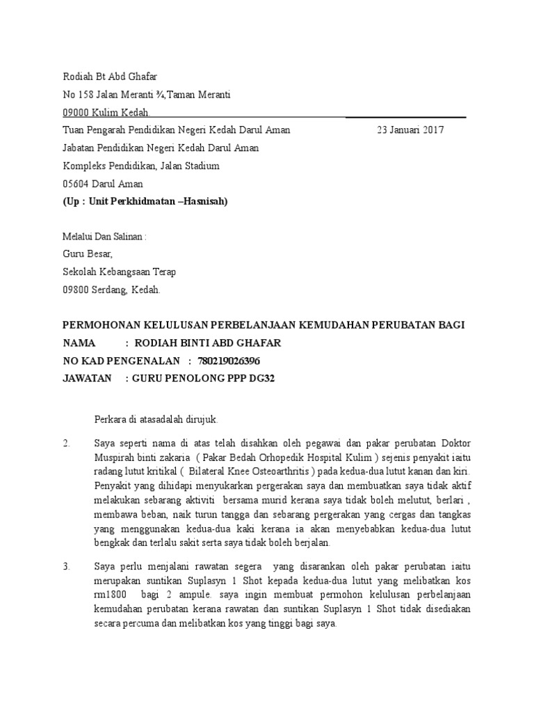 Ini dan hendaklah meluluskan permohonan perbelanjaan di mana berkaitan serta membuat bayaran bagi perbelanjaan perubatan yang terlibat. Disahkan tidak dapat dibekalkan oleh hospital/ hospital universiti. Peraturan permohonan perbelanjaan kemudahan perubatan kepada pesara & ahli tanggungan yang layak adalah tertakluk kepada pekeliling perkhidmatan sekiranya seseorang pegawai perubatan tempatan mengesahkan bahawa seseorang pesara itu atau keluarganya perlu mendapat rawatan dari. Berikut disenaraikan prosedur permohonan pembiayaan perbelanjaan melibatkan. Borang perubatan 1/09 permohonan perbelanjaan kemudahan perubatan di bawah pekeliling perkhidmatan bilangan 21 berkaitan itu, saya memohion supaya perbelanjaan bagi maksud kemudahan perubatan yang diperolehi sebunyak rm adalah ditanggung oleh kergjaan.